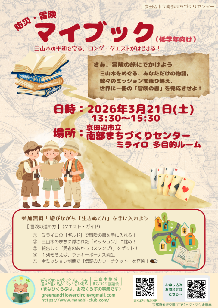 「冒険・防災マイブック」は、ただの記録ノートではありません。 京田辺のまちを歩き、仲間と笑いながら書き込むことで、一生モノの「危機管理能力」と「地域の絆」が身につく、世界に一つだけの冒険ガイドです。